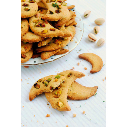 Za pomocą foremek wykroić ciastka, następnie ułożyć je na blaszce wyłożonej papierem do pieczenia, posypać wierzch pokruszonymi pistacjami i piec ok 10-15minut w temperaturze 180 C°..