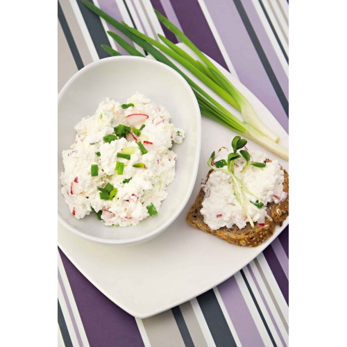 Twaróg rozgnieść w miseczce za pomocą widelca, dodać łyżkę lub dwie śmietany wiejskiej i wymieszać. Przyprawić solą i pieprzem. Do twarożku dodać pokrojoną w kostkę rzodkiewkę, posiekany szczypior i kiełki słonecznika. Podawać ze świeżym pieczywem, najlepiej pełnoziarnistym.